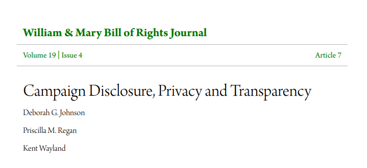 In this William & Mary Bill of Rights Journal article, authors Deborah G. Johnson, Priscilla M. Regan, and Kent Wayland explore the trade-off between privacy and transparency in the context of campaign finance disclosure requirements. As the authors’ explain, the policy discussions about balancing or reconciling the importance of public disclosure with the protection of individual privacy focus in large part on the purposes for which the information is likely to be used and the consequences of such uses for the individuals named in the record.